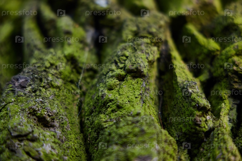 Подробный крупный план покрытой мхом коры дерева, демонстрирующий красоту природы
