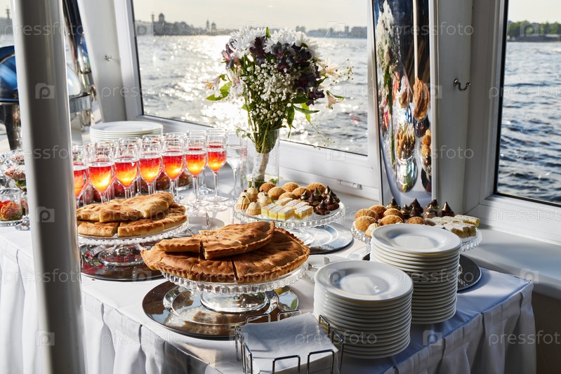 Элегантный банкетный стол, изящно расположенный на очаровательной живописной лодке