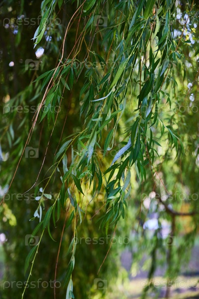 Потрясающе пышные зеленые листья ивы, покачивающиеся в нежных солнечных лучах в летние дни