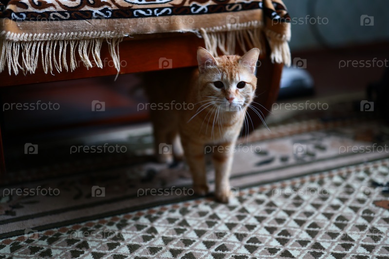 Очаровательный и игривый кот с радостью исследует пространство под мебелью в комнате