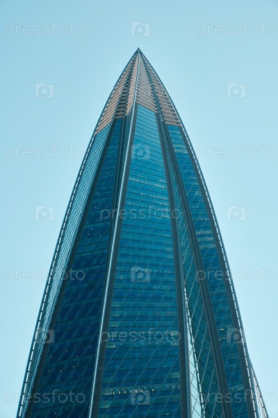 Современный небоскреб возвышается на фоне голубого неба, демонстрируя инновационный дизайн и архитектуру