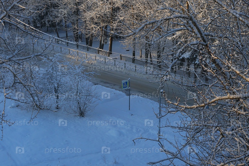 Зимняя сказка. Вид на покрытые снегом деревья, выстроившиеся вдоль тихой заснеженной дороги впереди