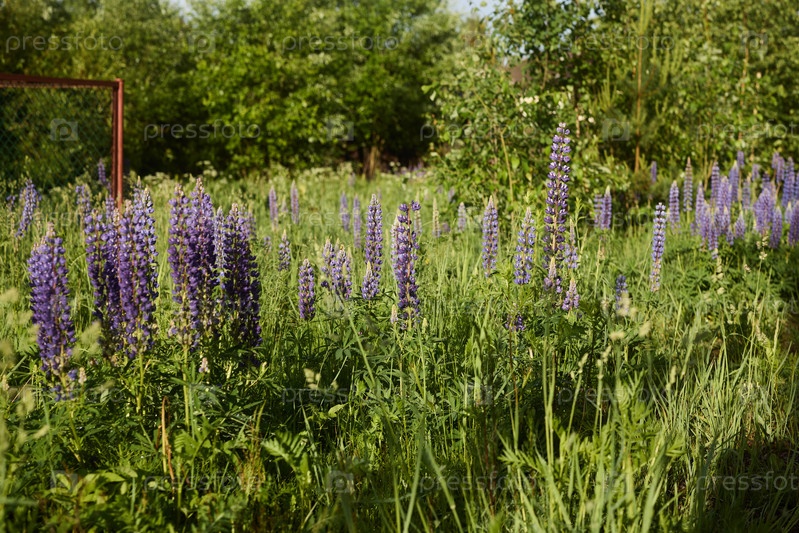 Яркие и потрясающие фиолетовые люпины цветут на пышном зеленом поле красоты природы