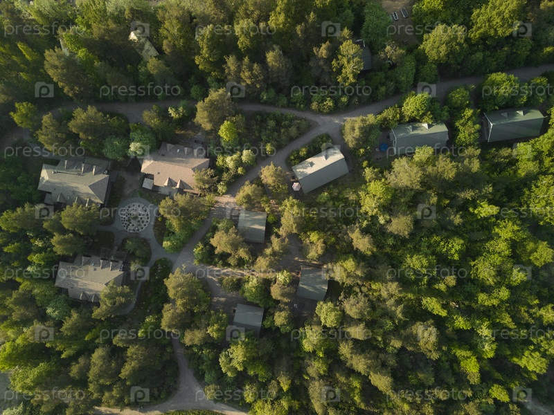 Прекрасный вид с воздуха демонстрирует дома, мирно расположившиеся среди пышного зеленого леса