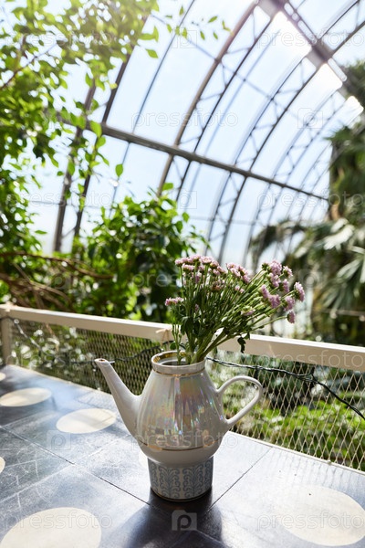 Очаровательная и красивая лейка, окруженная яркими цветами в пышной теплице