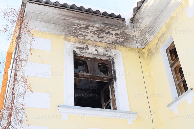 Заброшенное здание со значительными повреждениями от пожара, окруженное зарослями растительности