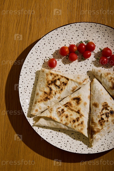 Вкусные и ароматные лепешки со свежими помидорами черри на деревенской тарелке