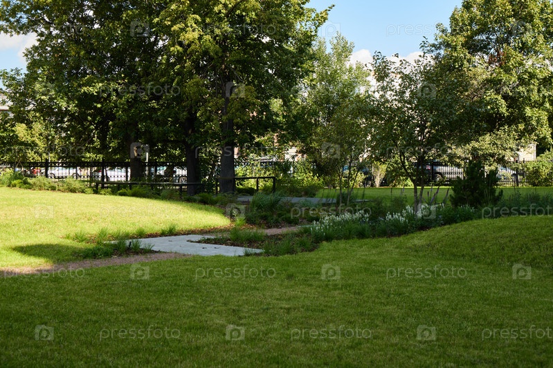 Красивый, пышный зеленый парк с яркими деревьями и тихим ручьем, протекающим через него