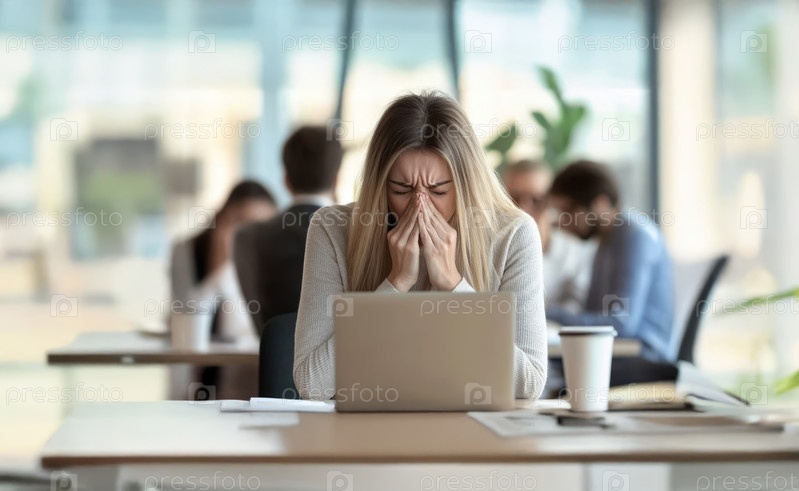 Больная бизнес-леди кашляет на семинаре, в то время как коллеги боятся коронавируса и прячутся. Сгенерированное изображение