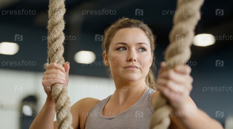Женщина плюс-size сосредоточена на тренировках с веревками в тренажерном зале, демонстрируя силу и решимость