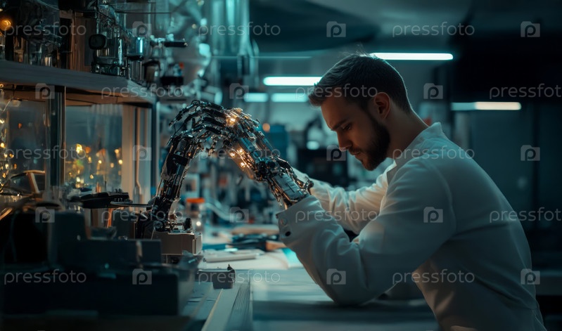 Инженер-робототехник калибрует роботизированный протез руки, демонстрируя передовые медицинские технологии. Сгенерированное изображение