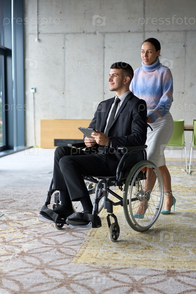 В деловой офисной обстановке деловая женщина помогает своему директору, который сидит в инвалидном кресле и пользуется планшетом, в то время как их коллеги сотрудничают на заднем плане