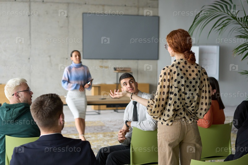 Группа разнообразных деловых людей сосредоточенно сидит в современном офисе, активно участвуя в обучающем занятии под руководством инструктора, уделяя особое внимание последним технологическим достижениям в мире бизнеса