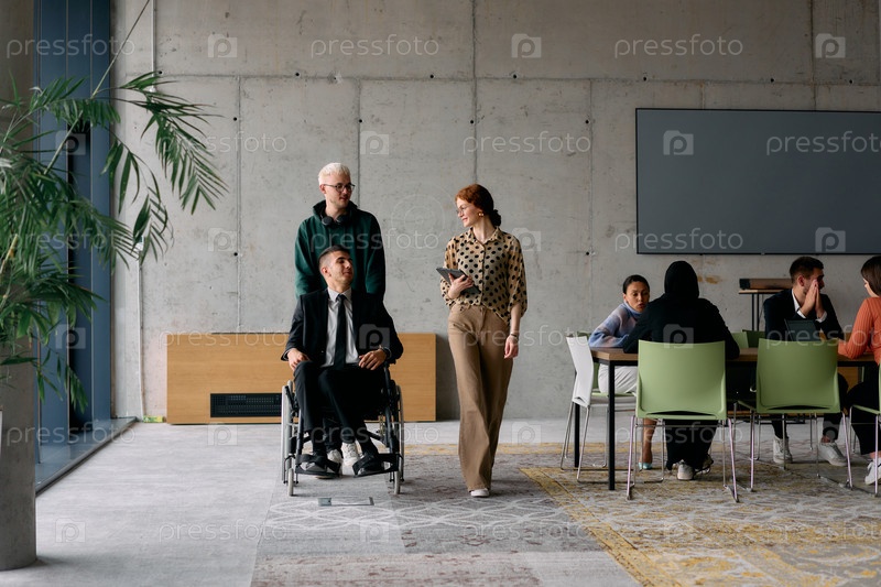 Разнообразная команда коллег по бизнесу, включая директора в инвалидной коляске, участвует в совместной дискуссии, перемещаясь по современному офисному пространству