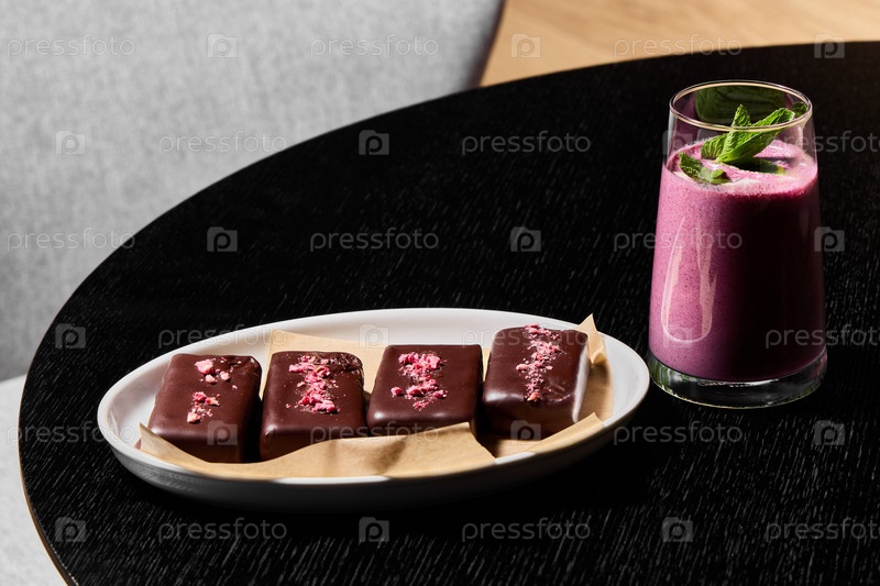 Вкусные и элегантные лакомства из темного шоколада, подаваемые с восхитительным ягодным смузи
