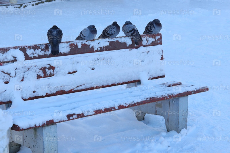 Голуби отдыхают на заснеженной скамейке в холодный и безмятежный зимний сезон