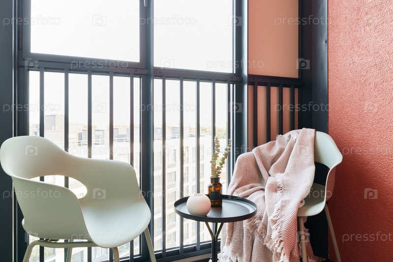Уютный балкон с современным декором и прекрасным живописным видом, которым можно наслаждаться