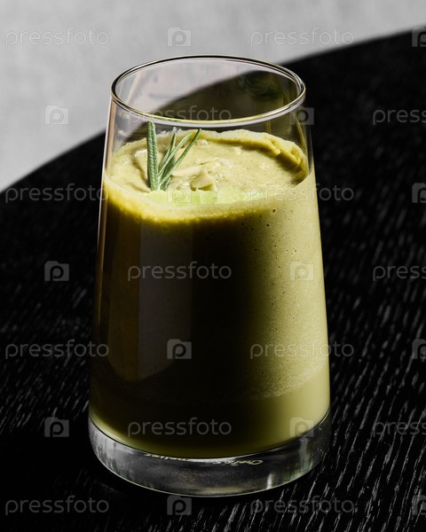 Зеленый смузи, элегантно поданный в стильном бокале, поставленном на темную поверхность стола