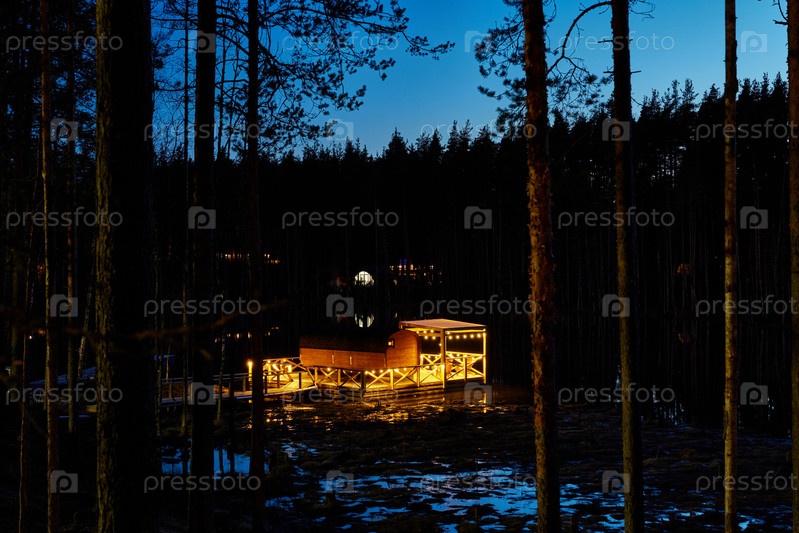 Почувствуйте безмятежный отдых в лесной хижине в сумерках, идеальный для спокойного отдыха