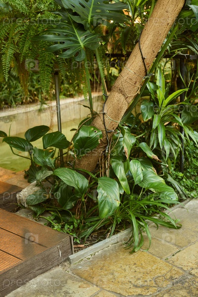 Пышная зелень и красивые тропические растения в современном и привлекательном саду