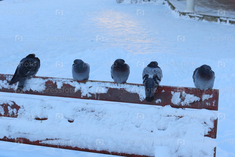Промерзшие птицы уютно устроились на отдыхе на заснеженной скамейке на открытом воздухе