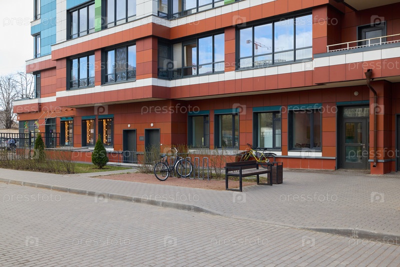 Современное городское здание с яркими открытыми пространствами и различными велосипедами