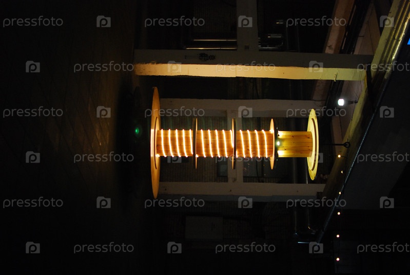 Художественное произведение «Подсвеченная высоковольтная катушка» в темной обстановке с уникальными эффектами