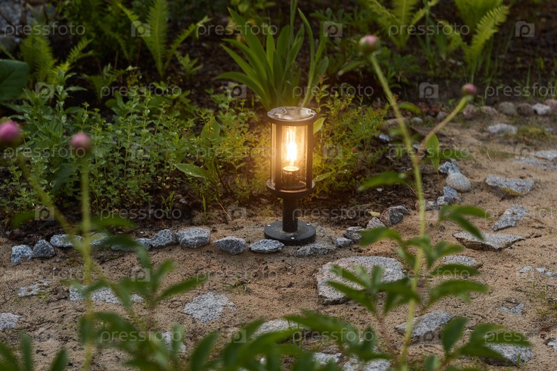 Элегантный садовый фонарь освещает безмятежный пейзаж в сумерках, создавая теплую атмосферу