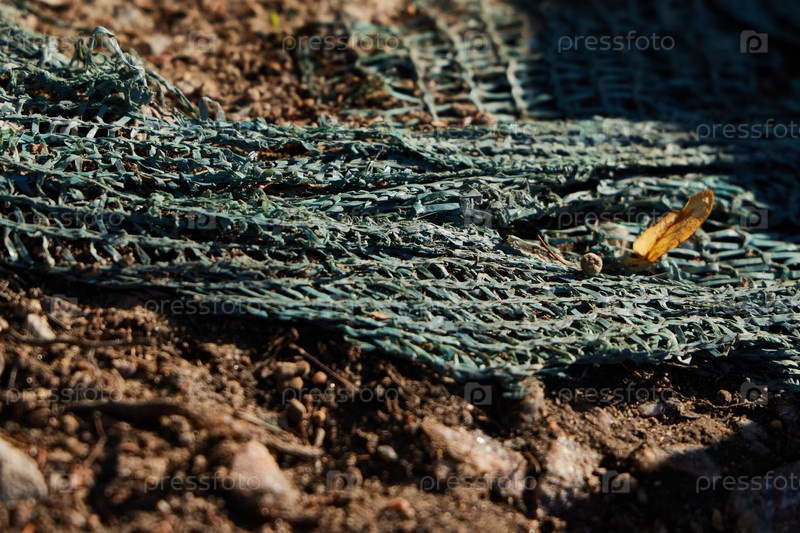 Крупный план зеленой садовой сетки, разложенной на земле в окружении пышной растительности