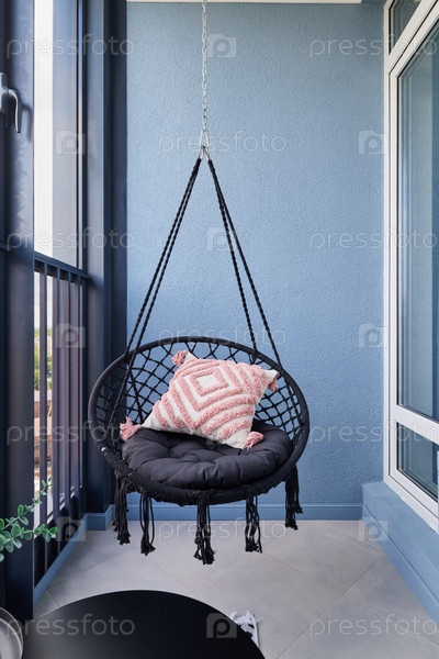 Стильное и удобное подвесное кресло, прекрасно расположенное на современном балконе