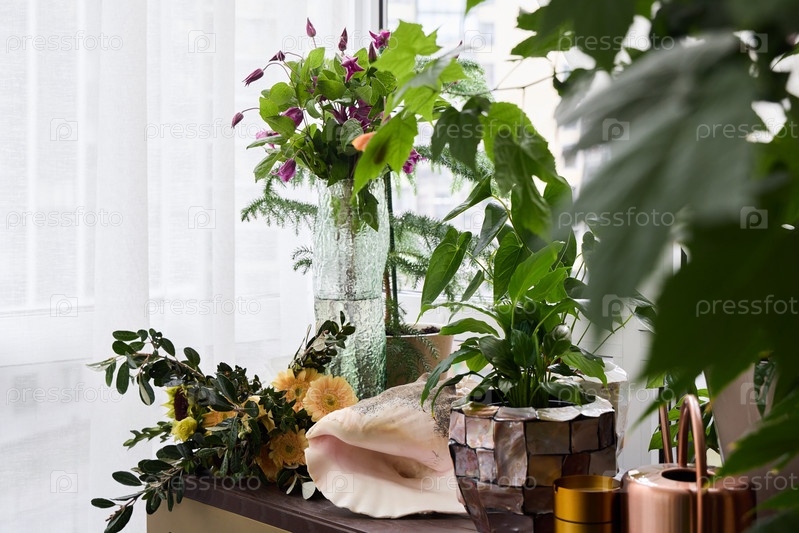 Изысканная и элегантная цветочная композиция, красиво размещенная на ярком и веселом подоконнике