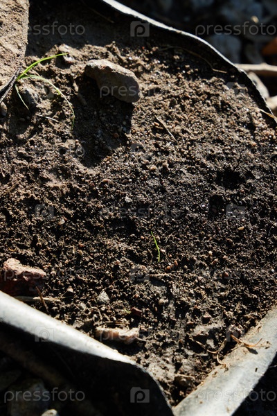 Крупным планом — свежая почва с крошечными ростками внутри посадочного контейнера