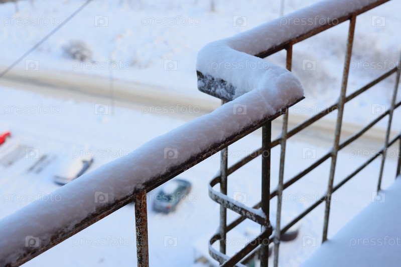 Заснеженные балконные перила, с которых открывается прекрасный вид на зимний пейзаж, полный очарования и чудес