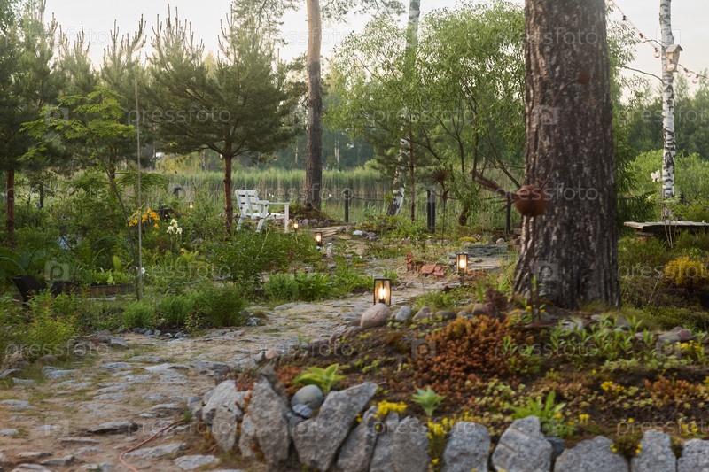 Красивая живописная садовая дорожка, окруженная пышными деревьями и безмятежной природой вокруг