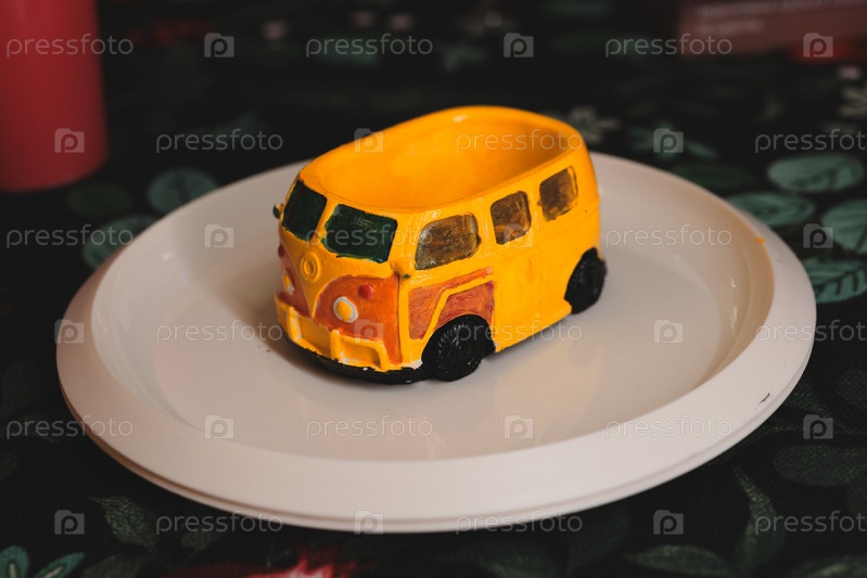 Восхитительно красочный миниатюрный десерт в форме автомобиля, элегантно размещенный на декоративной тарелке