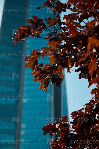 Красивые осенние листья на фоне яркой современной архитектуры в ярком городском пейзаже