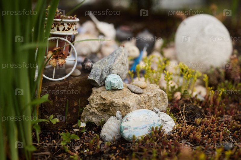 Очаровательный миниатюрный сад с красочными декоративными камнями и различными элементами