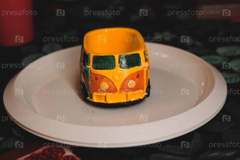 Яркий и красочный миниатюрный автобус VW, выставленный на декоративной тарелке для эстетического удовольствия