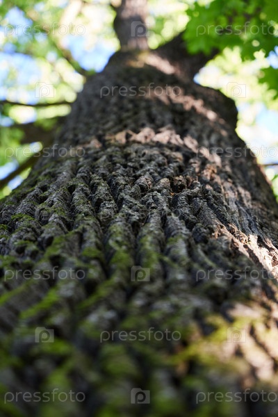 Величественный ствол дерева с замысловатыми узорами коры, окруженный пышными зелеными листьями