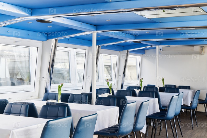 Откройте для себя современную обеденную зону на лодке с красивым синим потолком и шикарными столами