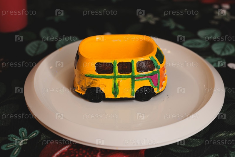 Потрясающий красочный керамический фургон, искусно представленный на декоративной тарелке для демонстрации