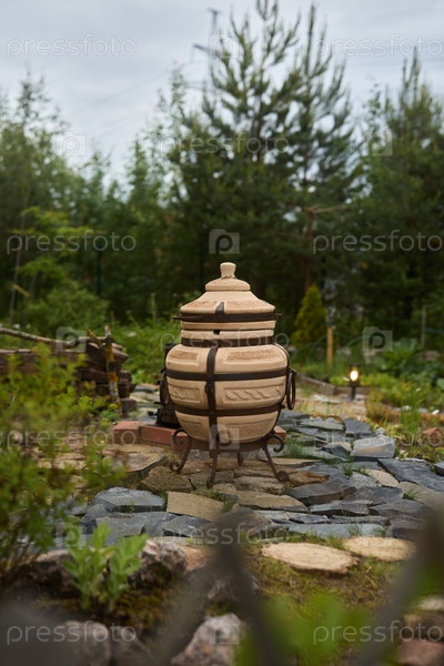 Красивый сад с традиционной уличной варочной поверхностью для приготовления кулинарных изысков