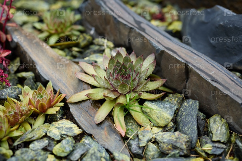 Красивое суккулентное растение, расположившееся среди камней в прекрасно оформленном садовом ландшафте