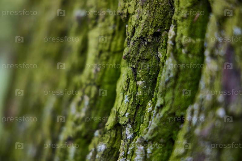 Крупный план сложной фактуры коры дерева с обильным зеленым мхом на ней