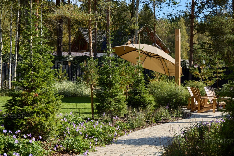 Уютный сад с очаровательной дорожкой и удобным зонтиком от солнца