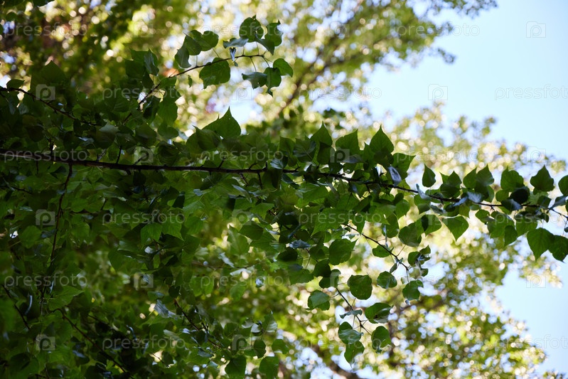 Яркие и сочные зеленые листья цветут на фоне ясного, прекрасного голубого неба