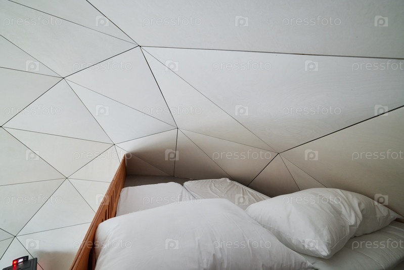 Эта современная спальня отличается уникальным геометрическим потолком, который улучшает эстетику помещения