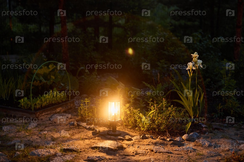 Красиво освещенный садовый фонарь, окруженный яркими цветами в ночное время