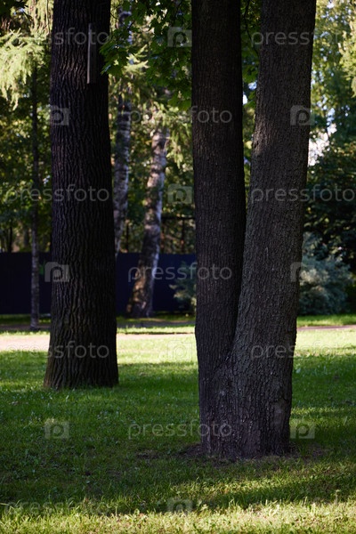 Спокойный парковый ландшафт с высокими деревьями и пышной, яркой зеленой травой вокруг