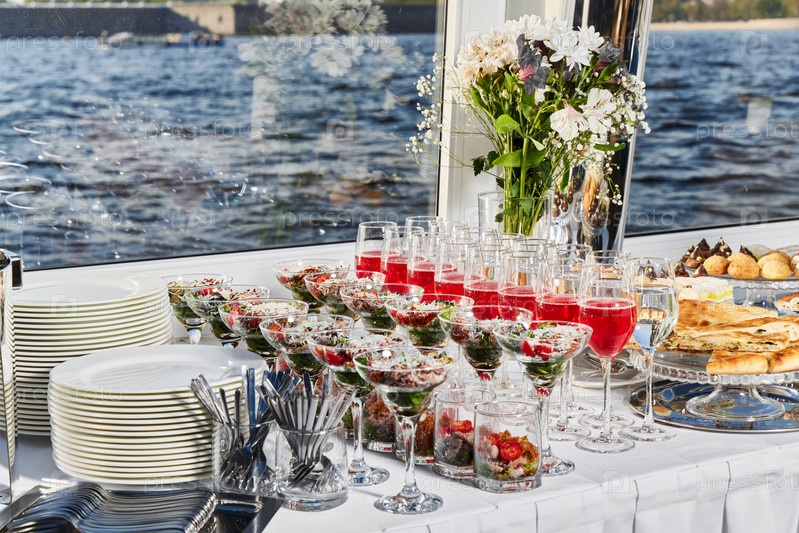 Элегантная обстановка мероприятия с изысканными десертами и освежающими напитками у воды